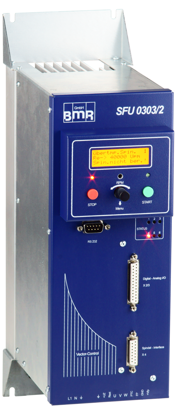 Frequenzumrichter zum Betrieb von sensorlosen AC-Motoren Drehzahlen von bis zu 100.000 Upm (1.667 Hz) Nennleistung 1.500VA / S1-100% Galvanische trennung aller Spindelsteuerleitungen vom Netz Integierter Bremschopper-Widerstand